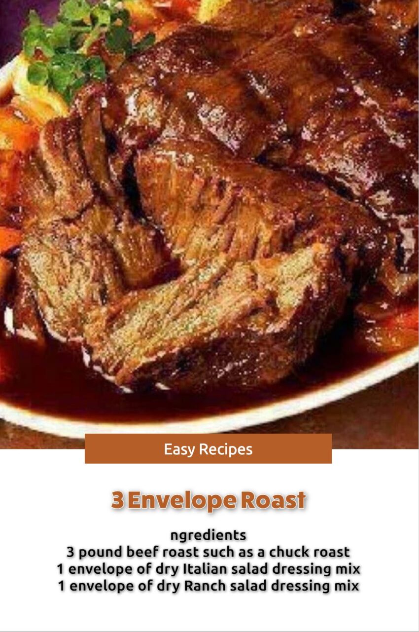 “Three Envelope Roast” is a recipe that involves using three types of seasoning packets or envelopes to flavor a roast, typically beef. The three envelopes usually consist of dry mixes such as onion soup mix, Italian dressing mix, and brown gravy mix. Here’s a basic recipe for Three Envelope Roast: