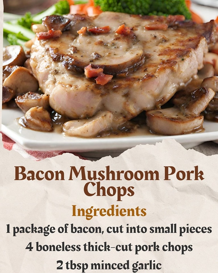 Bacon mushroom pork chops are a delicious and hearty dish that combines the savory flavors of bacon and mushrooms with tender pork chops. Here’s a simple recipe to make bacon mushroom pork chops: