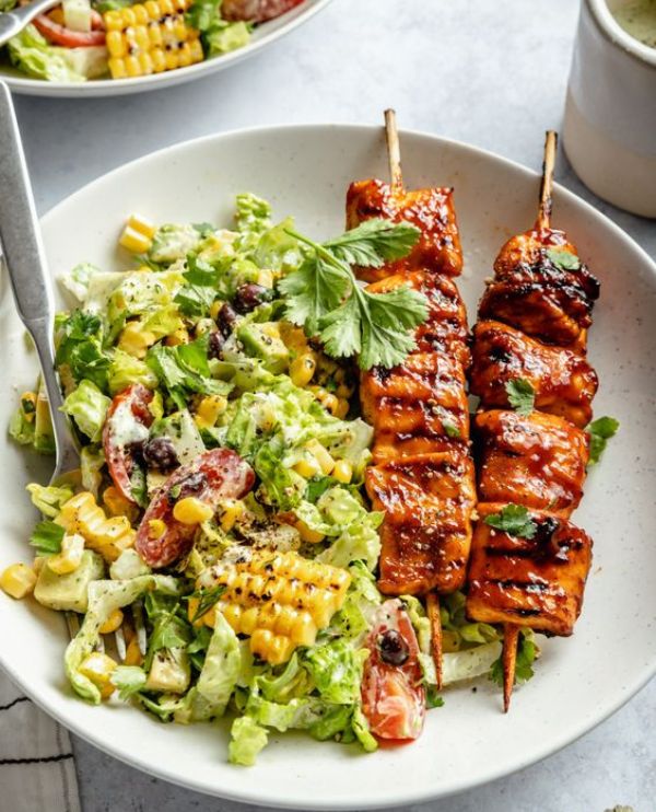 - Serve immediately and enjoy your delicious BBQ Chicken Skewer Salad!
