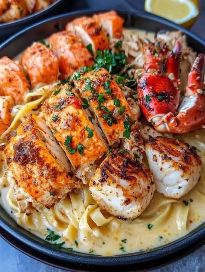 That sounds like a rich and flavorful seafood pasta dish! Here’s a recipe for Cajun Lobster, Crab & Salmon Alfredo, combining the decadence of shellfish and fish with creamy Alfredo sauce and bold Cajun spices.
