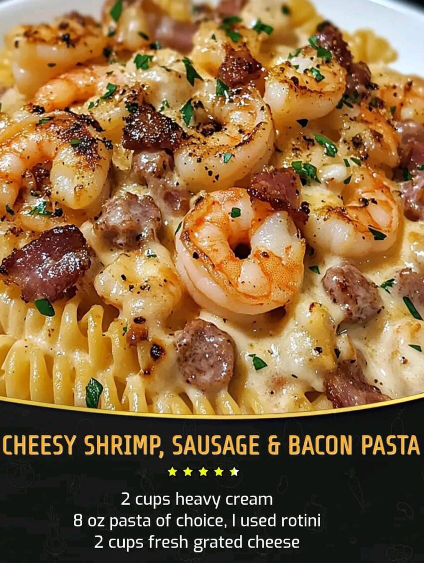 Here’s a delicious Cheesy Shrimp, Sausage & Bacon Pasta recipe that’s creamy, smoky, and full of bold flavor: