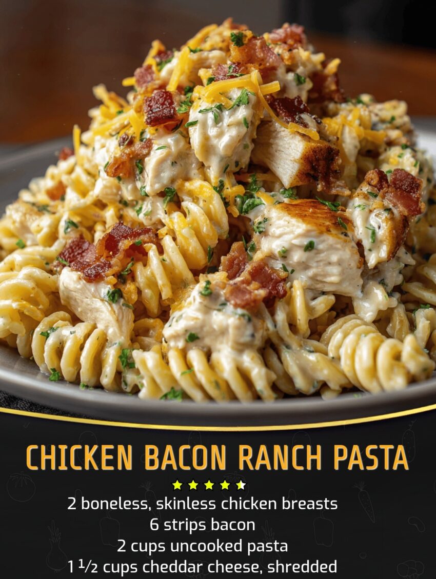 Chicken Bacon Ranch Pasta is a delicious and hearty dish that combines tender chicken, crispy bacon, creamy ranch sauce, and pasta. Here’s a basic recipe to get you started: