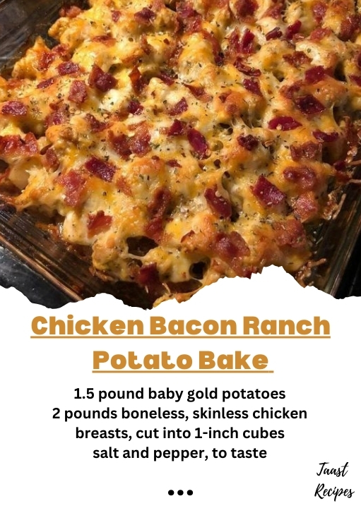 Chicken Bacon Ranch Potato Bake is a delicious and hearty dish that combines tender chicken, crispy bacon, creamy ranch sauce, and perfectly roasted potatoes. Here’s a simple recipe to make it: