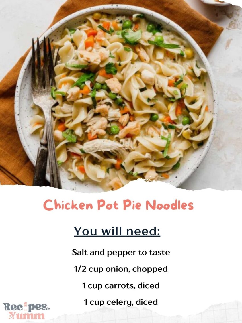 Chicken pot pie noodles are a delicious twist on the classic comfort food, chicken pot pie. Instead of a traditional pie crust, this recipe uses noodles as the base, creating a hearty and satisfying dish. Here’s a basic recipe to get you started: