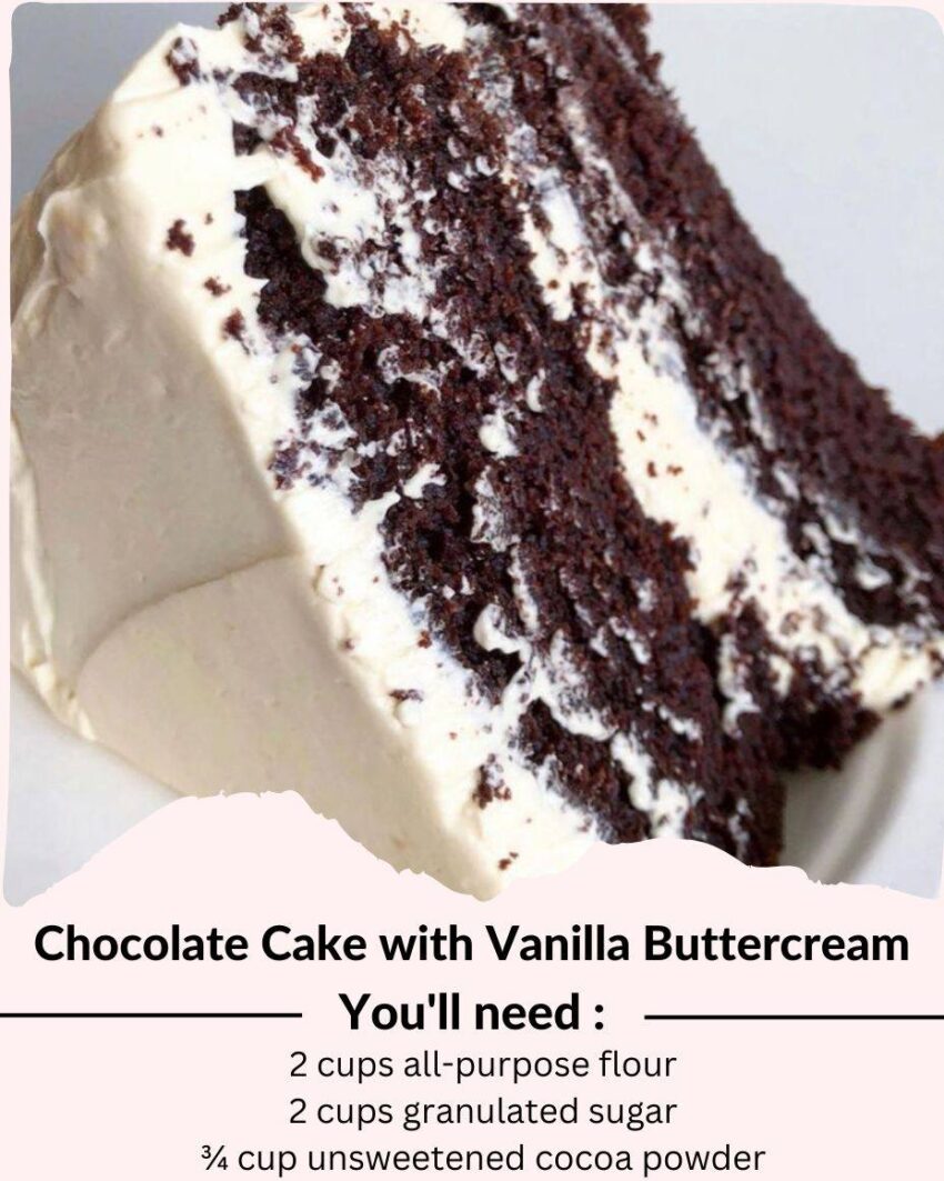 Here’s a classic Chocolate Cake with Vanilla Buttercream recipe that’s moist, rich, and perfect for any occasion.