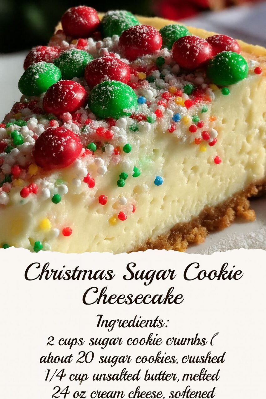 Here’s a festive and delicious recipe for a Christmas Sugar Cookie Cheesecake β€” perfect for the holidays! This dessert combines a sugar cookie crust with creamy cheesecake and is topped with holiday sprinkles or decorations for that extra Christmas flair.
