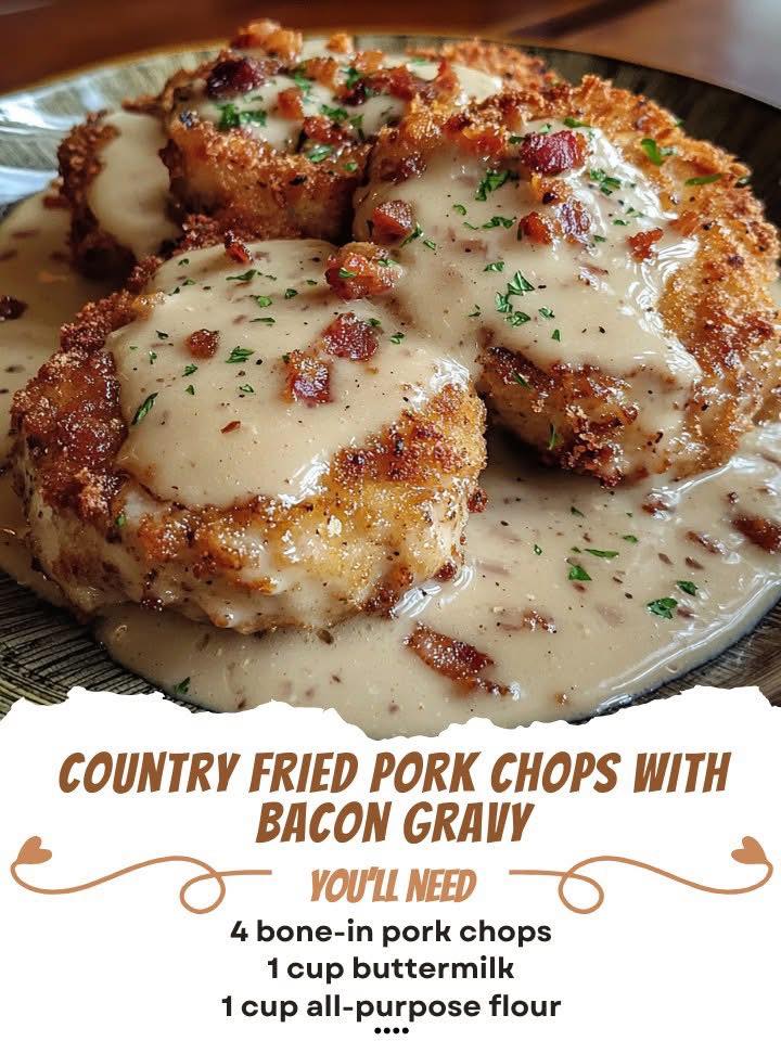 Ohhh yes, now that’s comfort food at its finest. Here’s a killer recipe for Country Fried Pork Chops with Bacon Gravy—crispy, juicy, and smothered in creamy, smoky goodness. Perfect for a hearty weekend dinner (or honestly, any time you need a food hug).