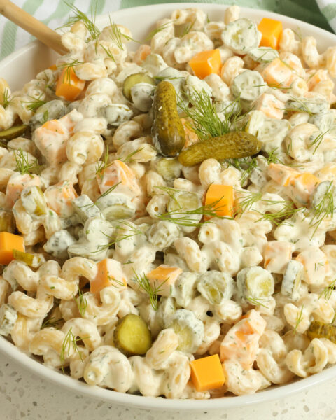 This dill pickle pasta salad is perfect for picnics, barbecues, or as a refreshing side dish for any occasion. Feel free to customize it by adding ingredients like shredded cheese, cherry tomatoes, or cooked and diced chicken for extra flavor and protein. Enjoy!