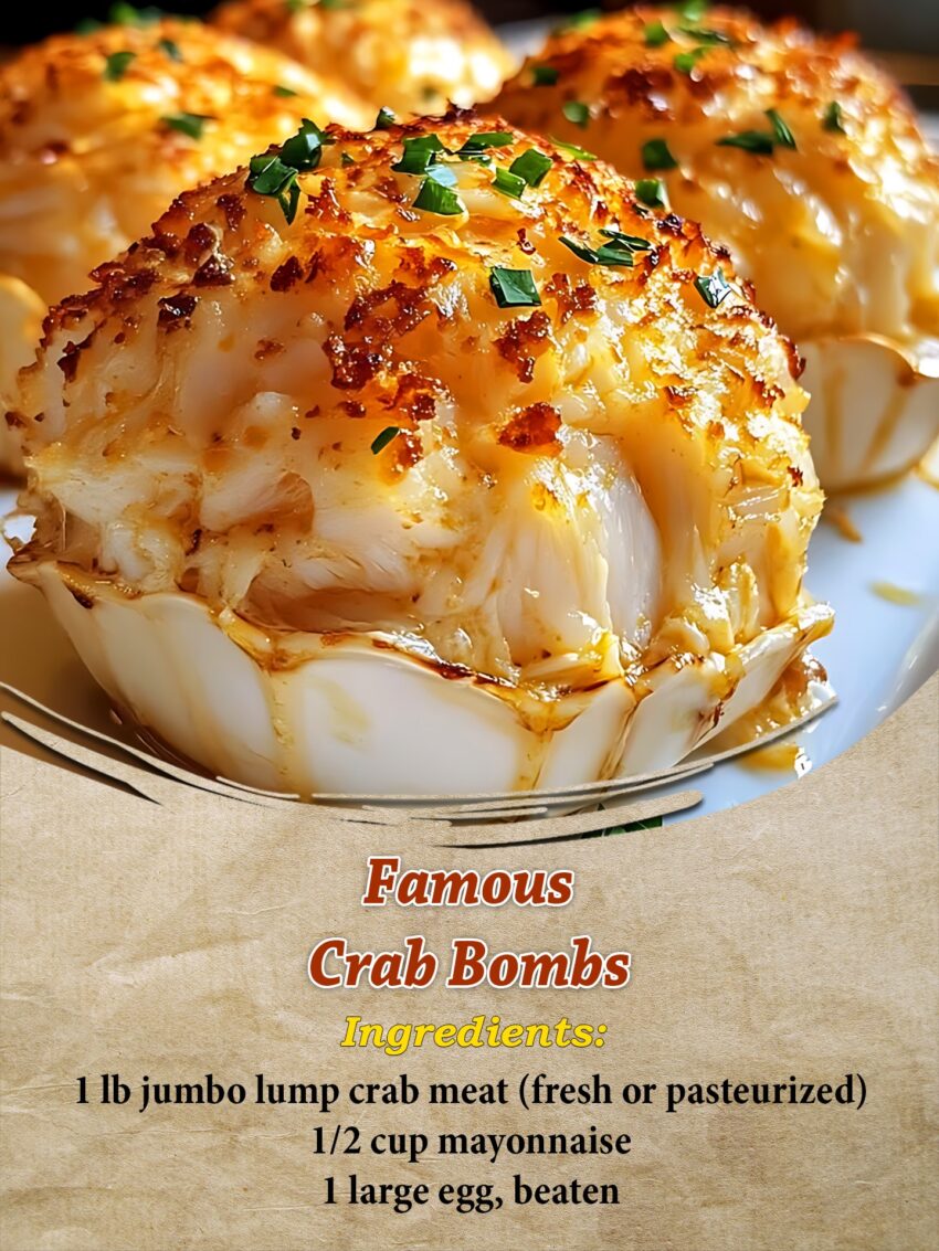 Here’s a classic and famous Crab Bombs recipe, popularized in the Mid-Atlantic, especially in Maryland. These “bombs” are essentially giant, jumbo lump crab cakes with minimal filler, known for their rich, savory flavor and buttery texture.