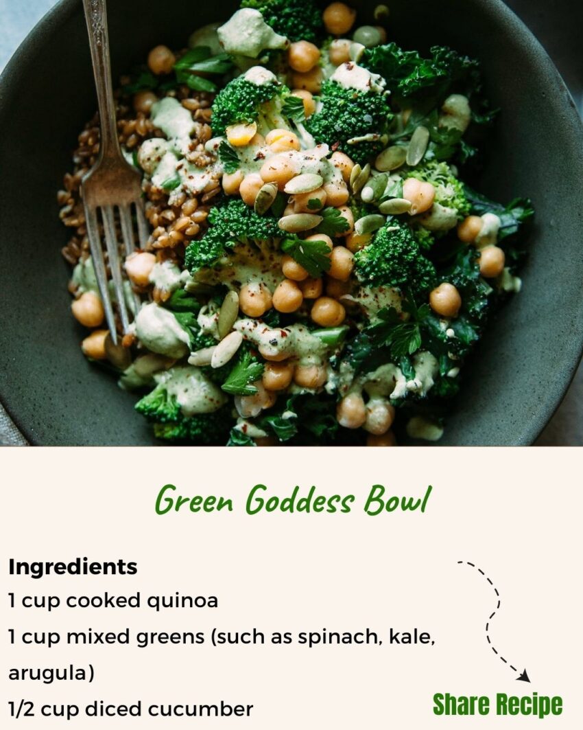 A Green Goddess Bowl is a nutritious and vibrant meal typically composed of a variety of vegetables, grains, proteins, and a flavorful dressing. The name “Green Goddess” often refers to the rich green color of the dish, which comes from the abundance of fresh leafy greens and herbs used in its preparation. Here’s a basic recipe to give you an idea of what might be included: