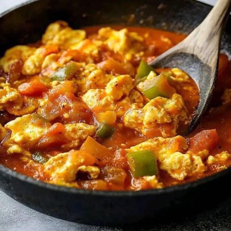 • Pour the beaten eggs into the skillet with the cooked onion and tomato mixture.