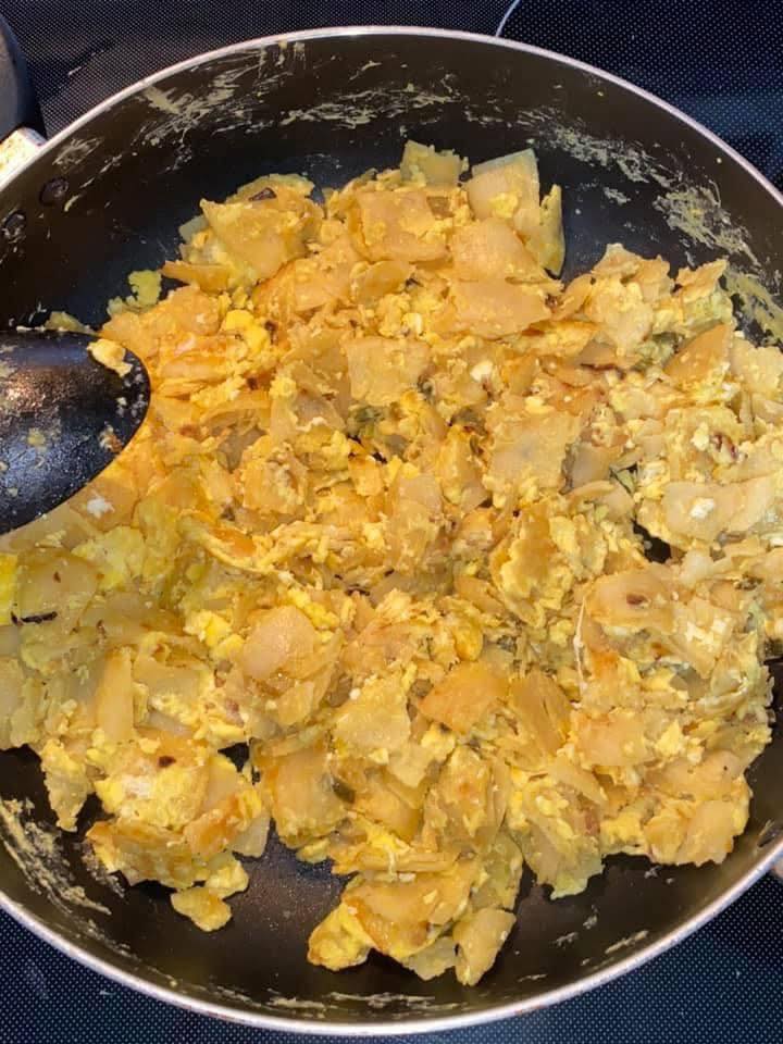• When eggs are nearly set, stir in the crispy tortilla strips.