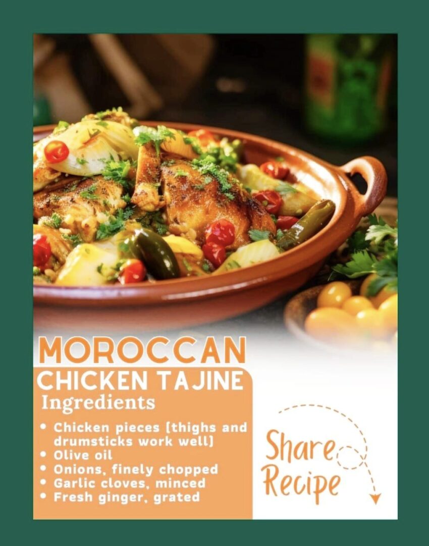 Moroccan Chicken Tajine is a traditional North African dish known for its rich and aromatic flavors. The term “tajine” refers to both the dish and the special clay pot with a conical lid in which it is typically cooked. Here’s a basic recipe for preparing Moroccan Chicken Tajine: