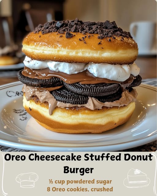 Here’s a fun and decadent Oreo Cheesecake Stuffed Donut Burger recipe that combines dessert and indulgence in one outrageous treat: