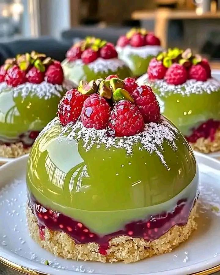 Pistachio and Raspberry Cheesecake Domes are a delightful dessert that combines the richness of pistachio flavor with the tartness of raspberries, all encased in a smooth, creamy cheesecake filling. These individual domes are both visually stunning and delicious.