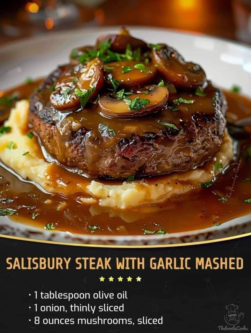 That sounds like a delicious meal! Here’s a complete recipe to make Salisbury Steak with Garlic Mashed Potatoes and Mushroom & Onion Gravy:
