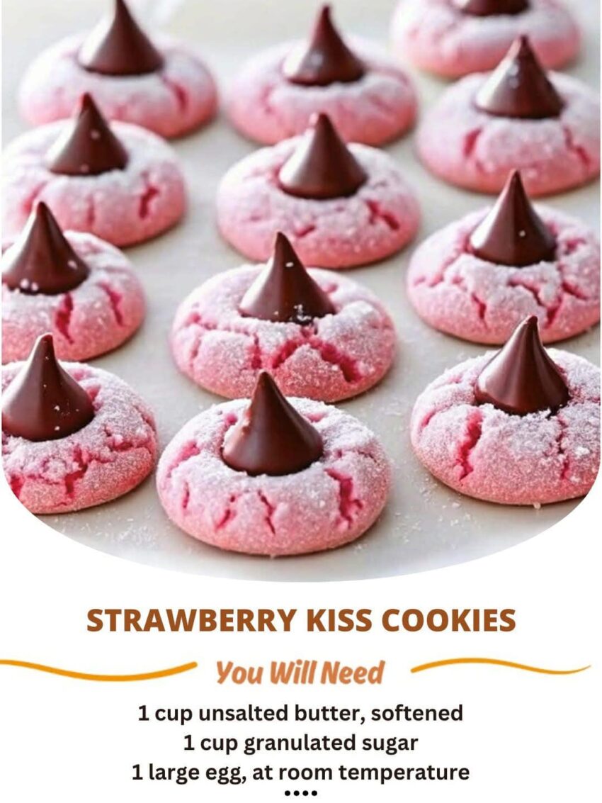 Here’s a delicious recipe for Strawberry Kiss Cookies. These cookies are soft, sweet, and have a fun twist with a strawberry-flavored candy or a strawberry jam in the center!
