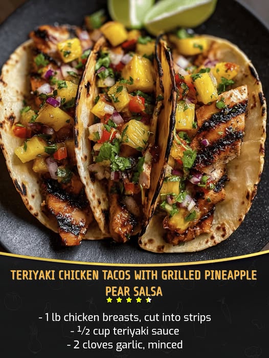 Here’s a delicious and tropical recipe for Teriyaki Chicken Tacos with Grilled Pineapple Pear Salsa—a fusion of sweet, savory, and smoky flavors wrapped in a warm tortilla!