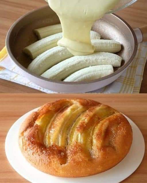 - Pour the cake batter over the banana layer in the cake pan, spreading it evenly.